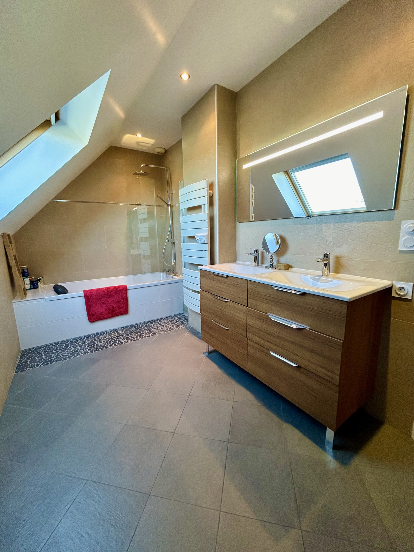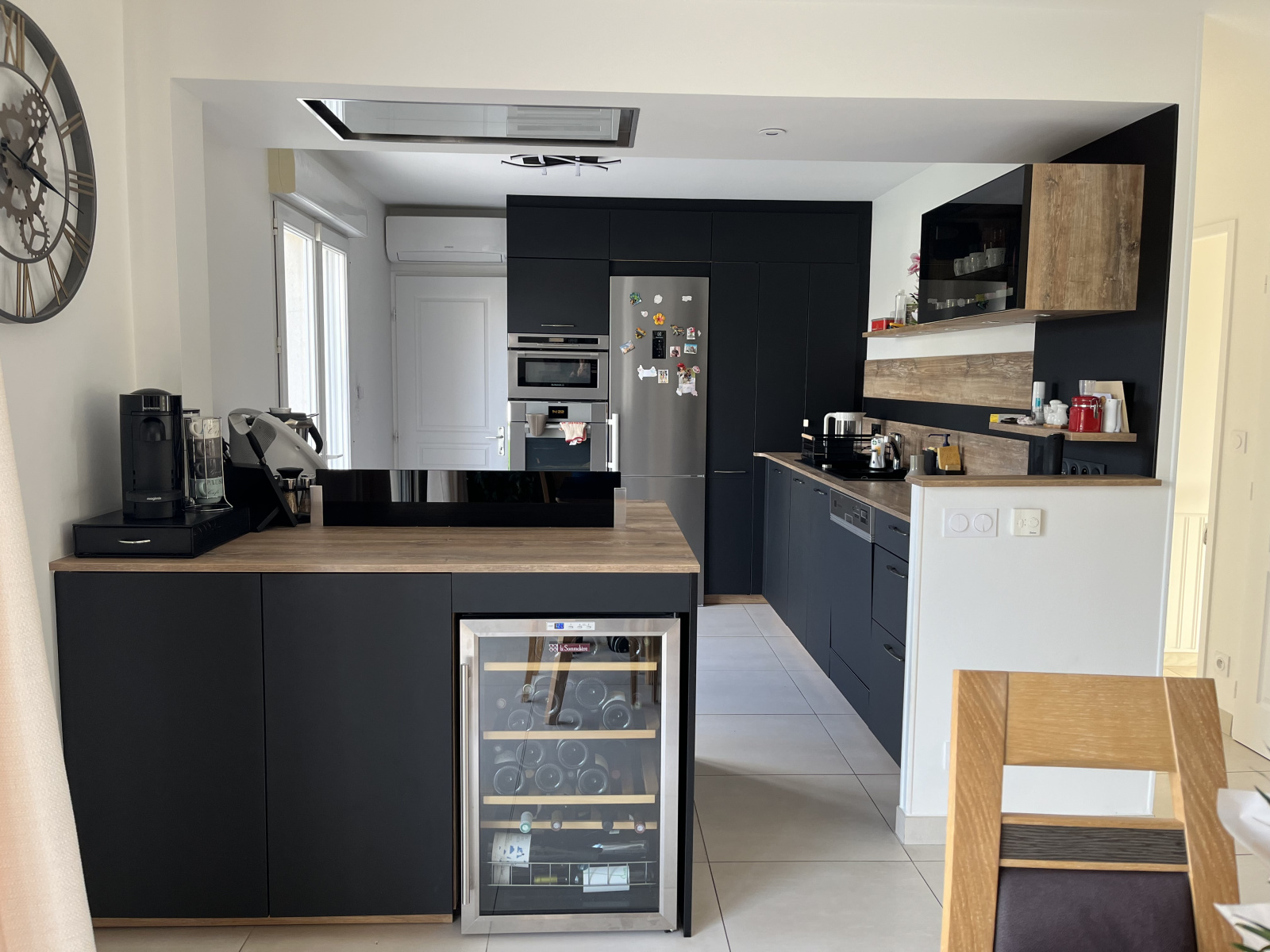A l’étage : palier desservant trois chambres dont une avec dressing, salle de bains, salle d’eau, wc, rangement. Chauffage électrique sol et convecteurs, poêle et pompe à chaleur. Terrasse.