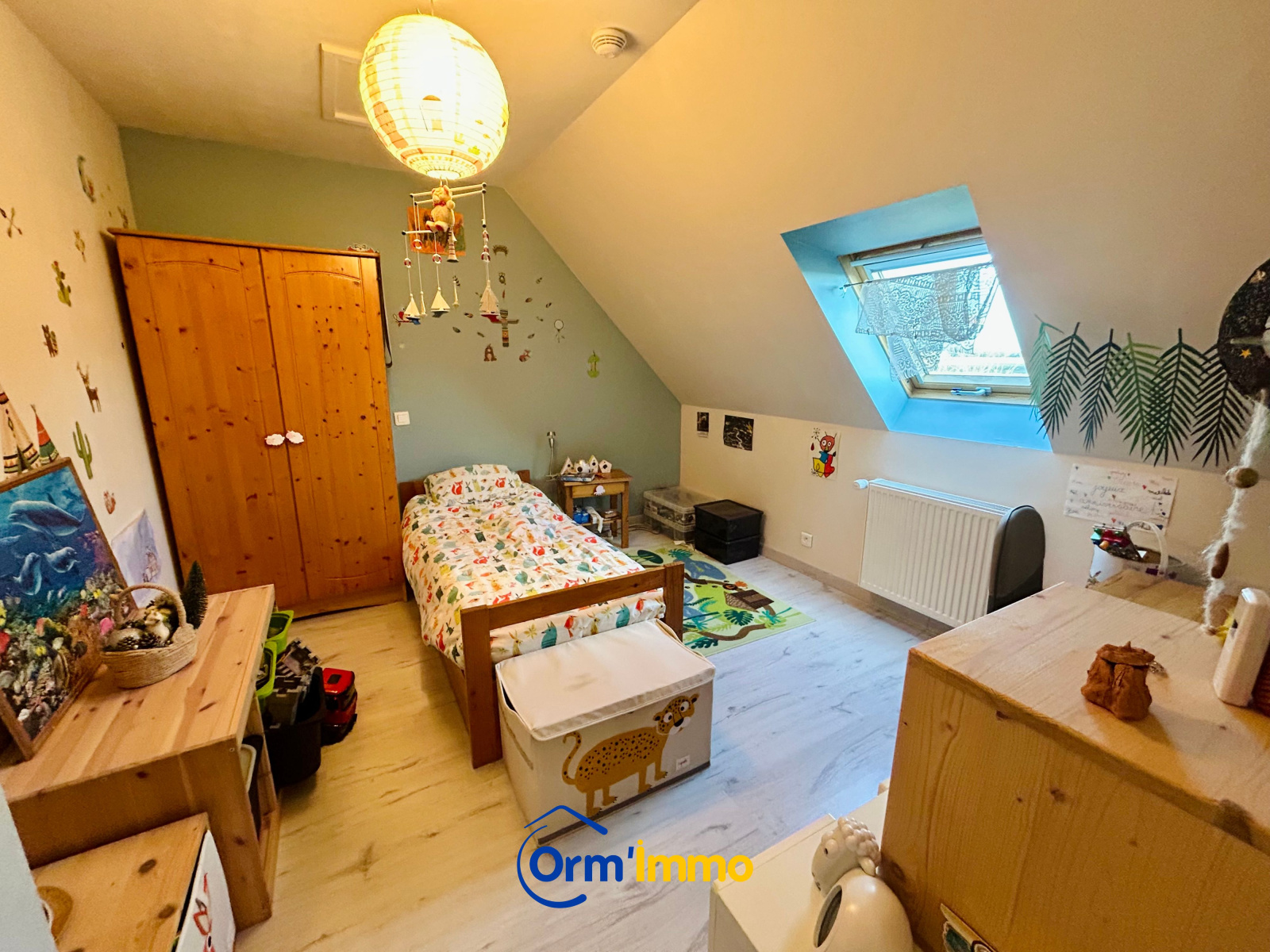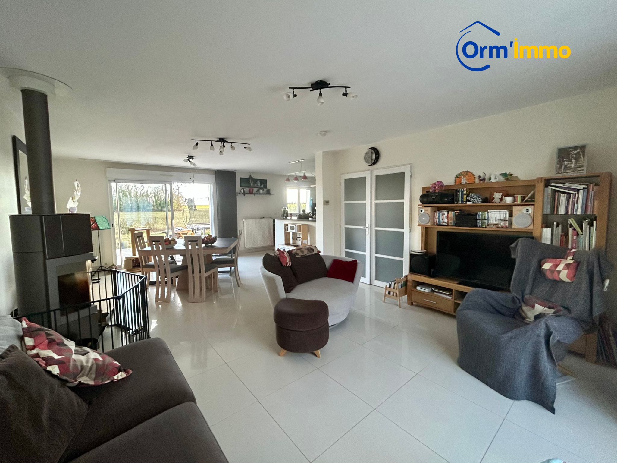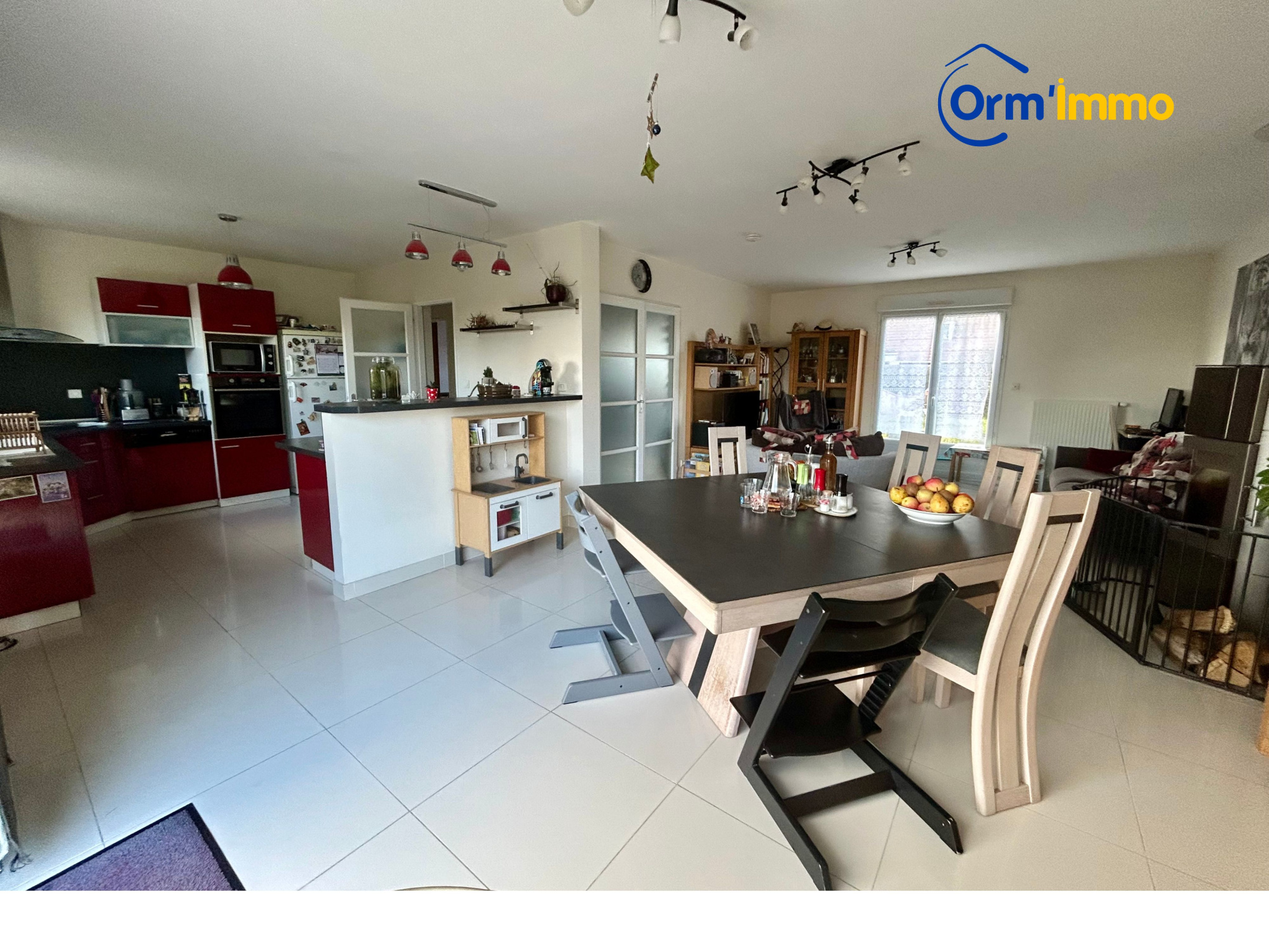Sur environ 834 m2 clos, PAVILLON ELEVE SUR SOUS-SOL TOTAL, comprenant : Hall cathédrale, salon-séjour avec poêle, cuisine aménagée et équipée ouverte, dégagement, chambre, salle de bains, wc et cellier.