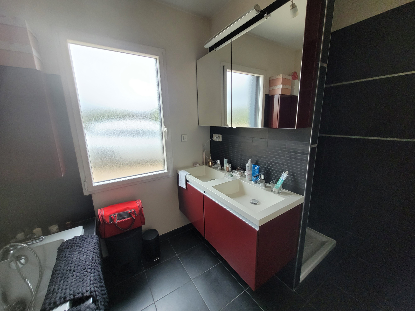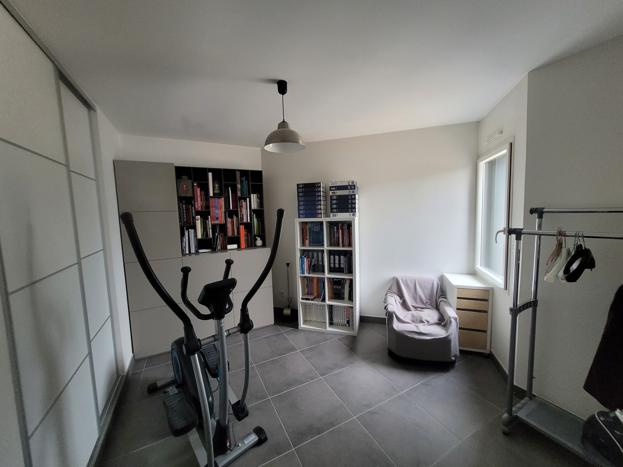 Une belle pièce de vie lumineuse avec de larges baies vitrées ouvrant sur la terrasse