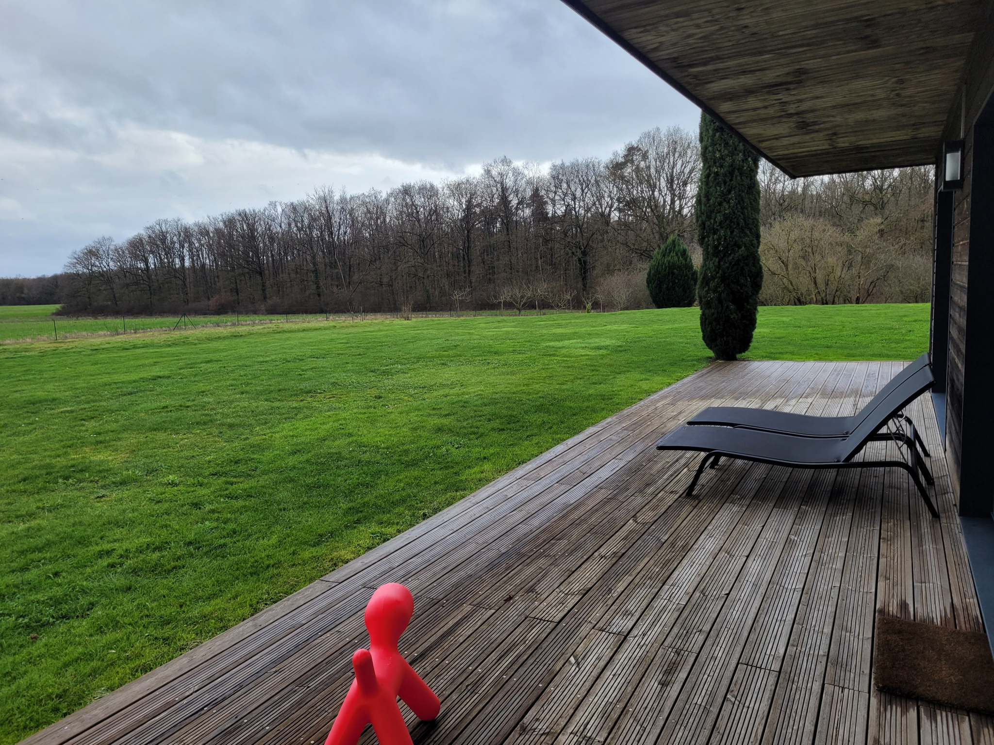 Grande terrasse bois permettant de profiter pleinement du jardin et de la vue dégagée
