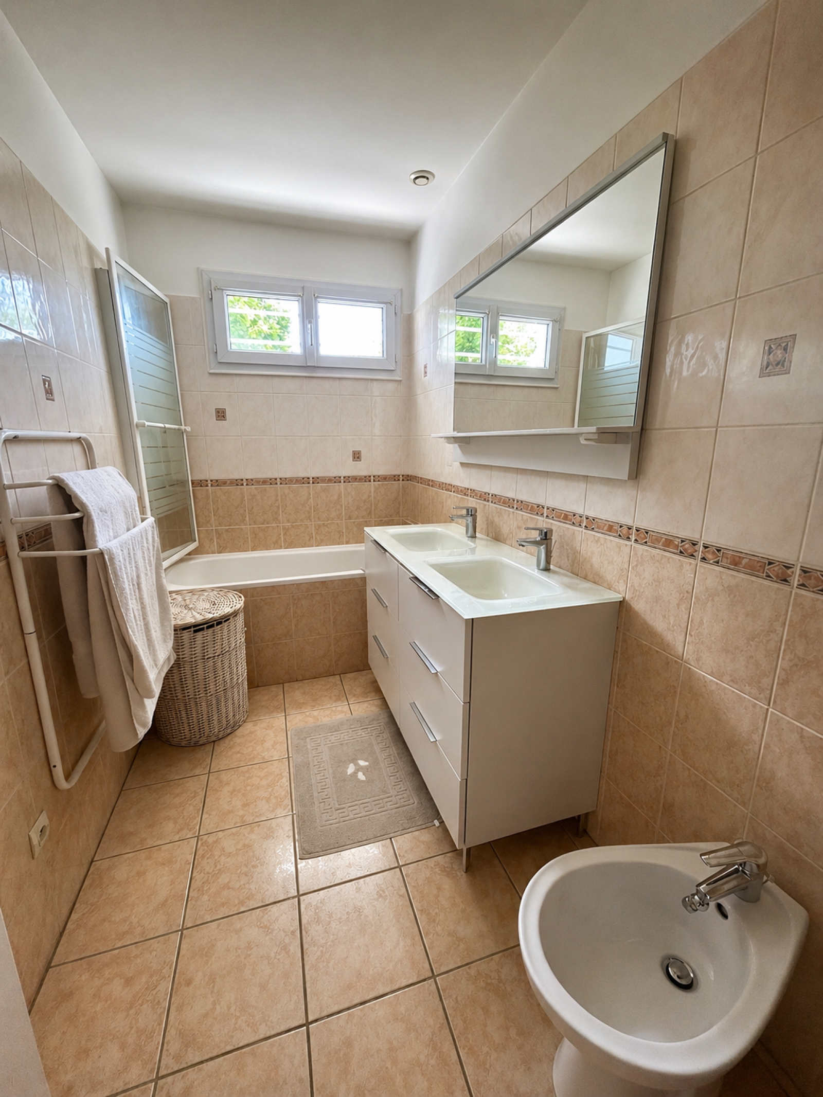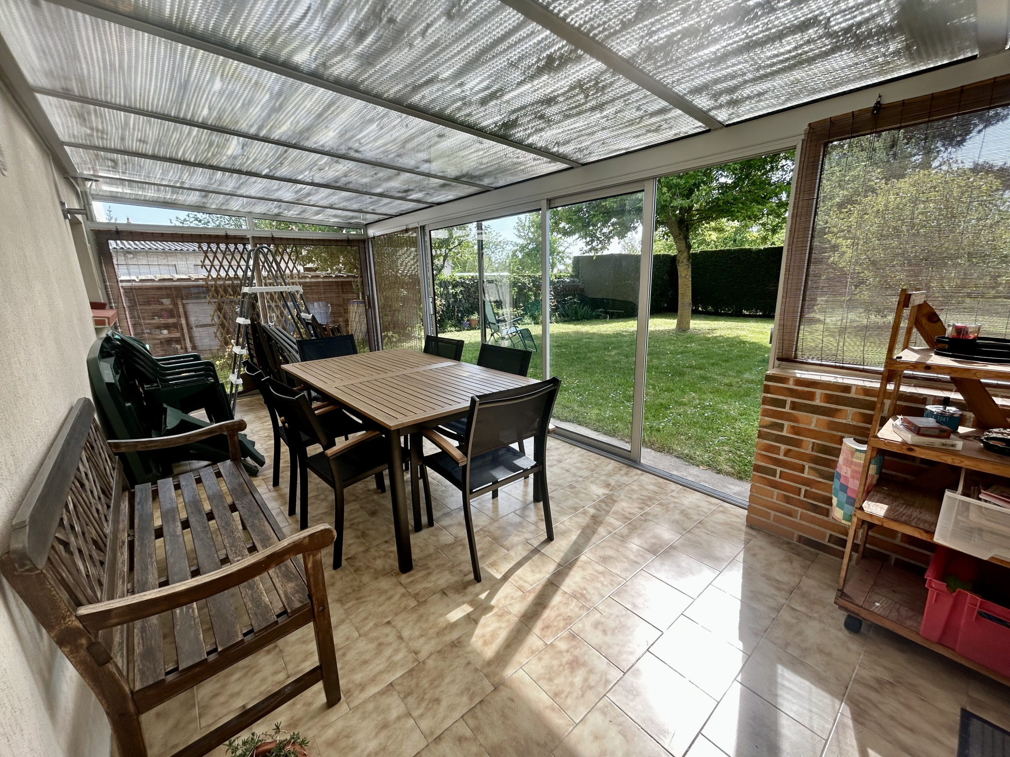 Au rez-de-jardin : Partie garage, deux chambres, salle d'eau, buanderie et wc. Véranda sur l'arrière.