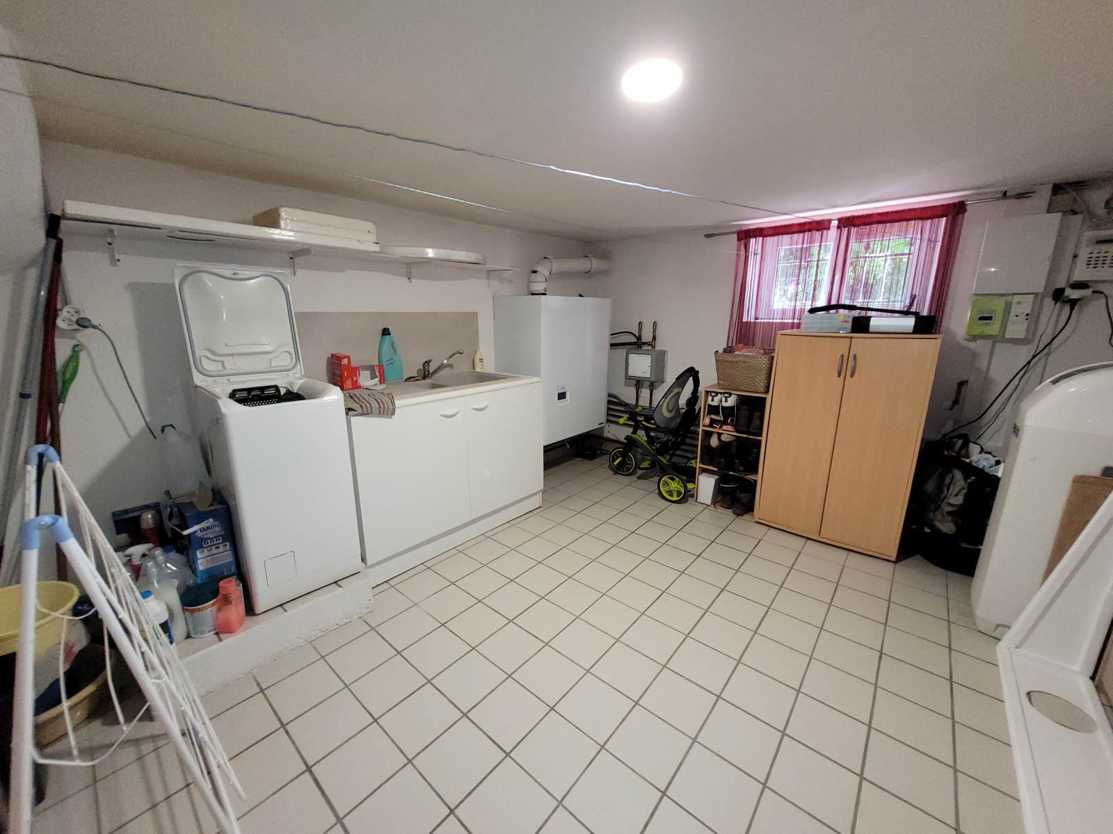 A l'étage : Palier desservant deux chambres avec placards, salle de bains avec baignoire, douche et wc. Partie lingerie, chaufferie et cave en sous-sol.